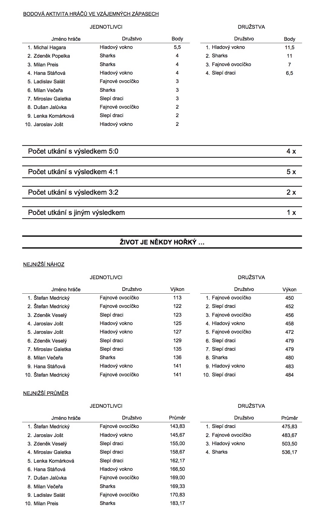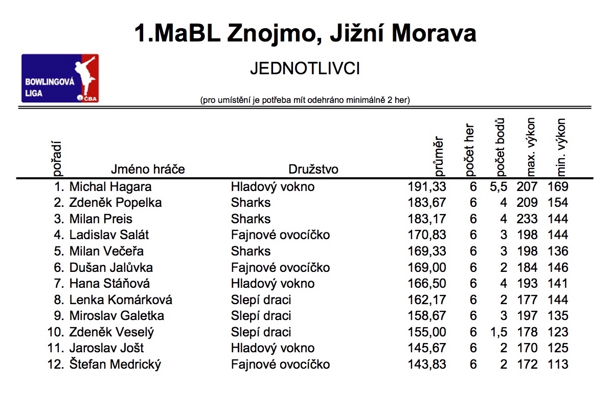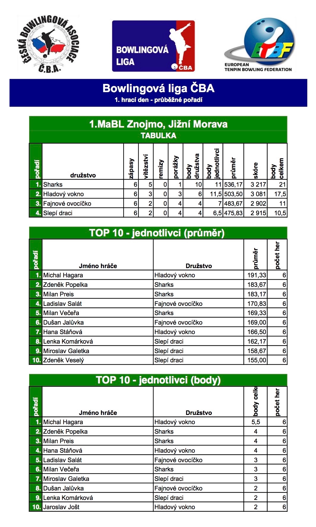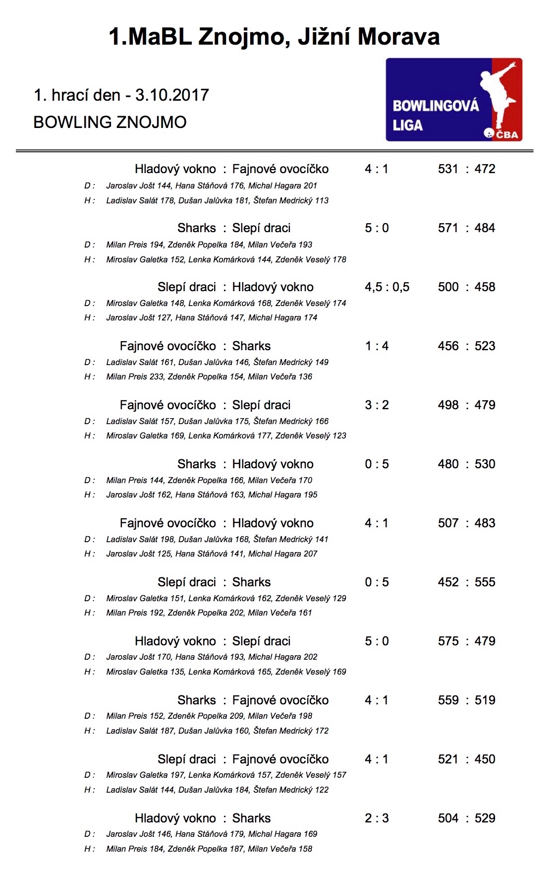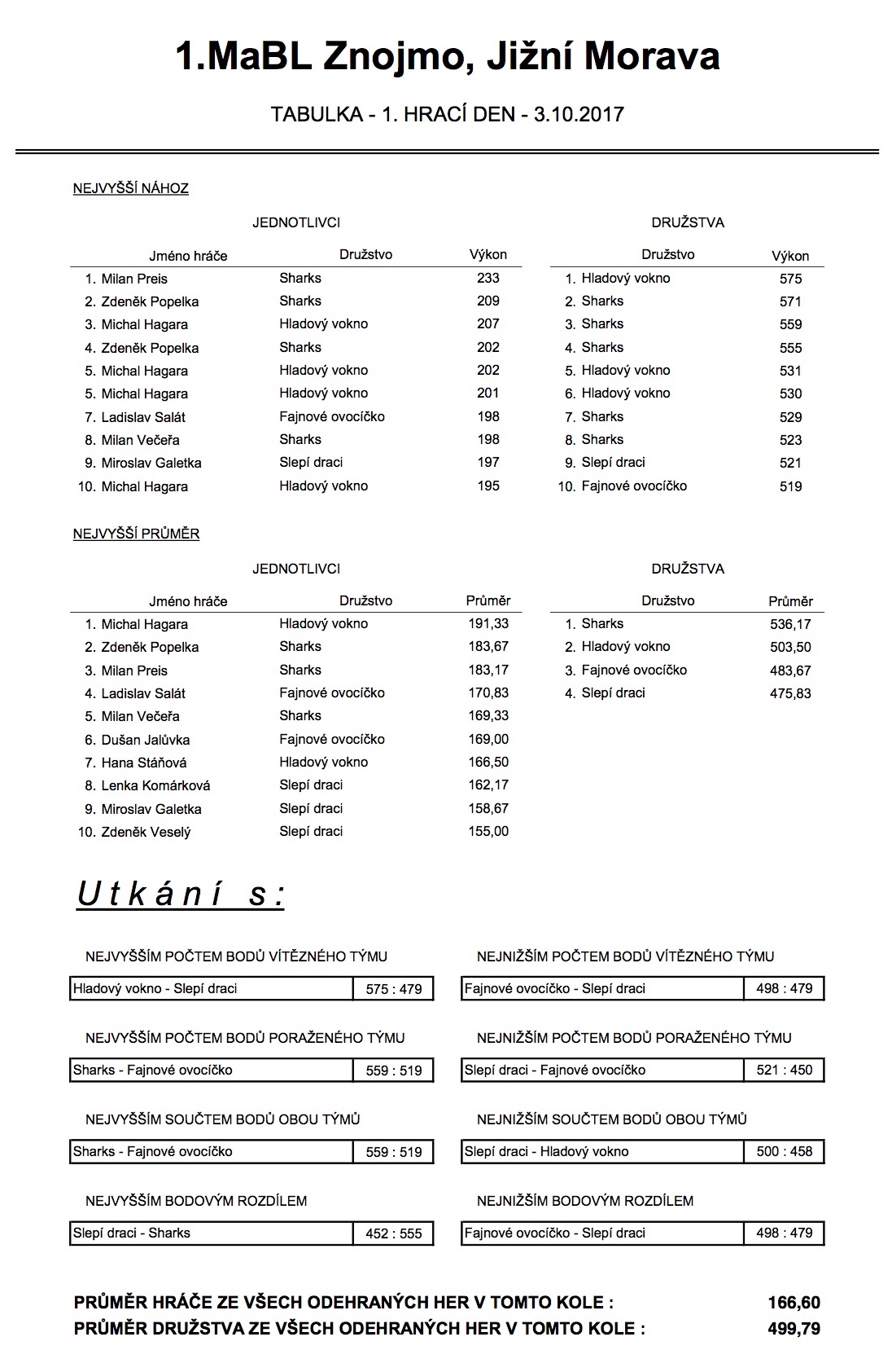 V úterý 3.10.2017 odehrála družstva 1. Městské amatérské bowlingové ligy první kolo ročníku 2017/2018. Výsledky naleznete jako vždy v článku.
